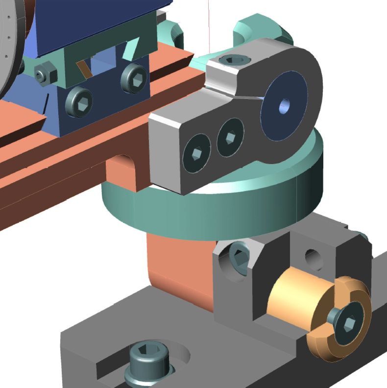 Der Drehkopf sitzt auf einem Stahlteller und dreht um eine 8mm Stahlachse. Axial wird der Kopf mit einer selbstsichernden Mutter M6 verspannt, die Drehklemmung geschieht mit zwei Spannbüchsen welche in einer tangentialen Bohrung zur Drehachse liegen. Der Kopf besitzt am Umfang eine Gradteilung und trägt zwei eingeklebte 19mm Wellenstummel zur Aufnahme der Klemmfäuste des Werkzeugträgerarmes.