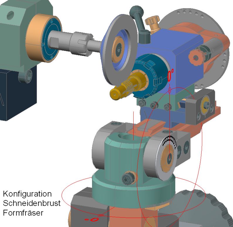 Mit der Vorrichtung bestehen verschiedene Möglichkeiten zum Schärfen der Stirnschneiden von Schaftfräsern, hier eine davon: