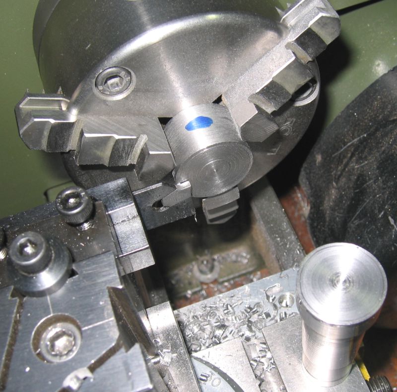 dann auf Tiefe 29 mm die Bohrung 14 mm für das Zugrohr ausgedreht. Danach zylindrisch 18mm die Außenkontur mit Übermaß für den MK.