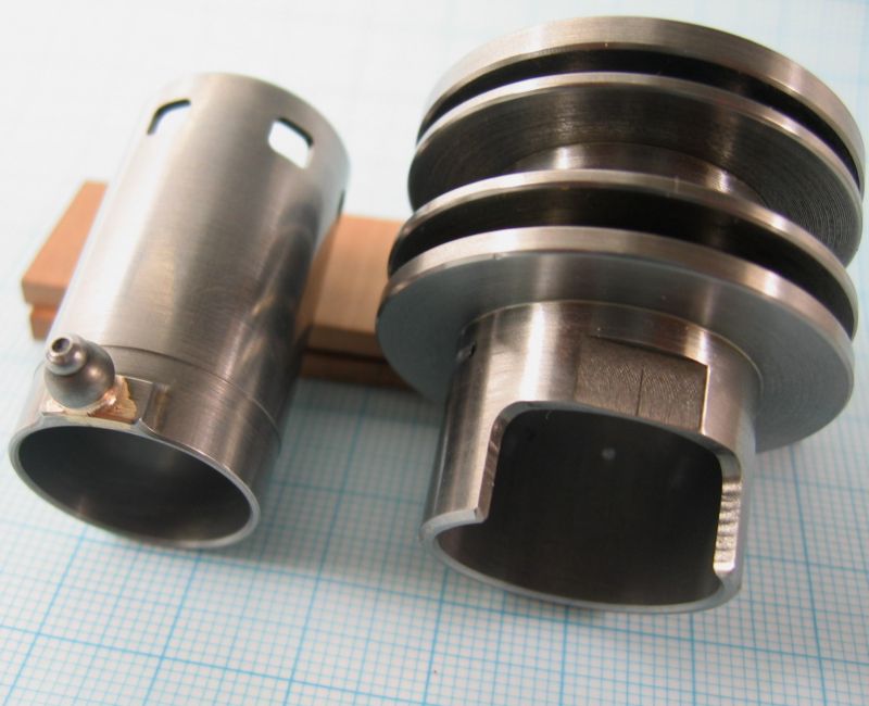 Geläppt wurde mit 400er und 800er Korundpaste. Die Passung Büchse zu Außenzylinder erhielt ein Spiel von 5tausendstel Millimeter und der Kolben aus Grauguss hat 15tausendstel Spiel in der Steuerbüchse aus ETG, hier übernehmen die Kolbenringe die endgültige Abdichtung und der Kolben hat genügend "Luft" wenn's mal thermisch "eng" wird.