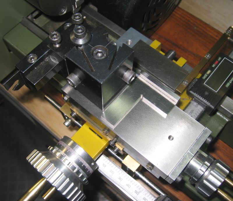 Bei so kleinen Maschinen ist es sehr wichtig den Stahlhalter auch mal an einer leicht versetzten Stelle montieren zu können. Besonders in Reitstocknähe wird es sehr schnell eng, spätestens seit dem ich neben dem Planzug dort einen Maßstab angebaut habe, aus dem Grund hatte ich auch schon mal eine zweite Gewindebohrung in den Support eingebracht, Weitere werden bei Bedarf folgen.